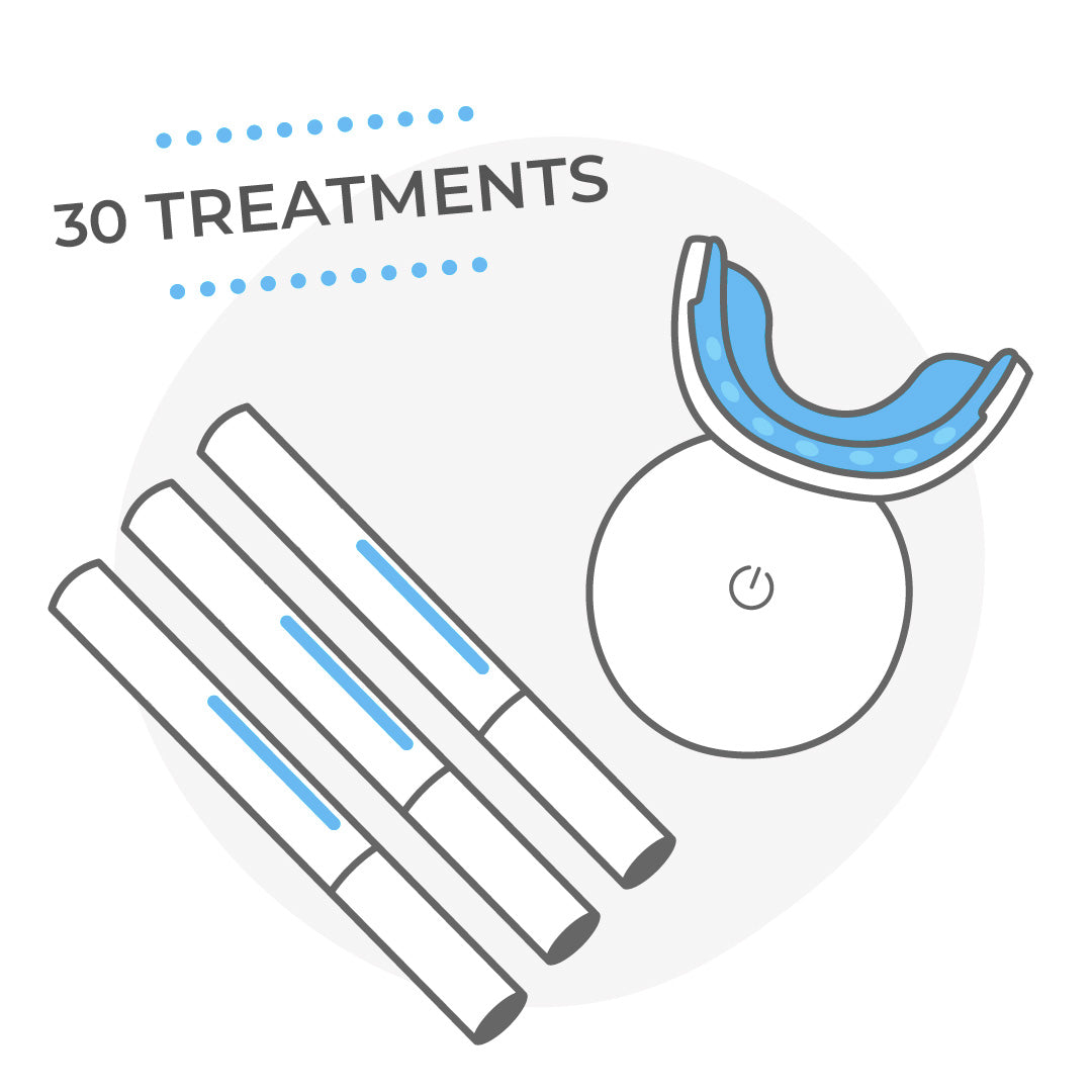 Your Advanced Whitening Kit will come with a mouth tray, accelerator light and 3 pens containing a total of 30 treatments of whitening formula.